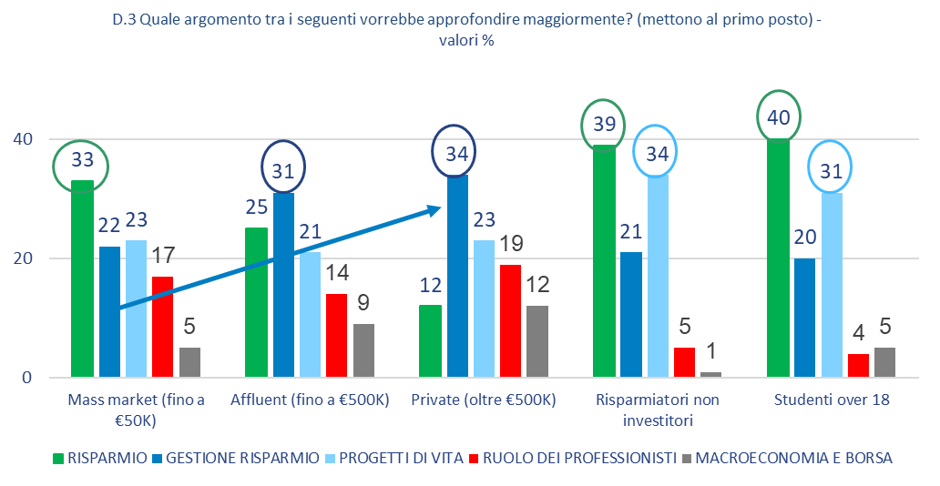 La gestione del risparmio interessa in particolar modo i clienti affluent (31%) e private (34%), acquisendo quindi più rilevanza con l’aumentare del patrimonio. Diverse sono le ragioni, fra chi è interessato a queste tematiche, che spingono le persone a volerne sapere di più: perché percepiscono il ruolo centrale della finanza nell’economia del Paese (75%), per l’importanza della finanza in generale (66%), perché interessati alla gestione dei propri investimenti (44%), perché interessati ai propri risparmi (34%)per evitare di fare errori e/o poter valutare l’operato dei propri referenti (17%) o, ancora, perché interessati o appassionati alla materia di studio (6%).