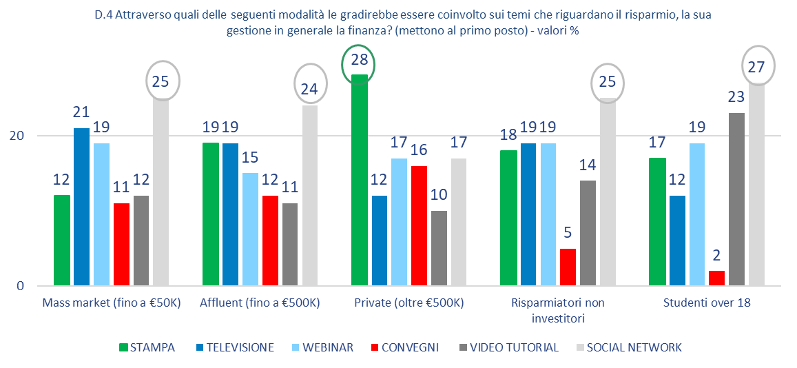 Tra i mezzi di informazione preferiti spiccano i social network, che conquistano tutte le fasce del campione (dal 17% dei clienti private al 27% degli studenti) e si fanno largo nuove modalità, come i webinar (dal 15% degli affluent al 19% per mass market, risparmiatori non investitori e studenti over 18), emersi con forza durante i mesi dell’isolamento forzato. Tiene, a pari merito, la televisione con punte del 21% nel mass marketLa carta stampata, invece, rimane rilevante tra i private che, per il 28%, preferiscono informarsi con modalità più tradizionali.