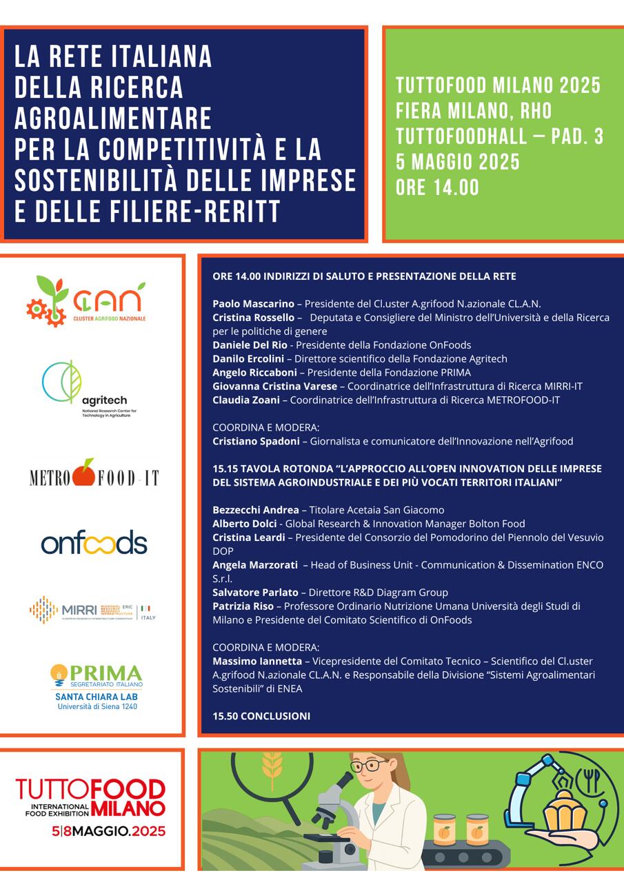 Il 5 maggio 2025, alle ore 14.00, presso Tuttofoodhall (Pad. 3, Fiera Milano, Rho), sarà presentato a TUTTOFOOD Milano 2025 l’accordo sottoscritto dal CL.USTER A.GRIFOOD N.AZIONALE CL.A.N., con i protagonisti delle iniziative AgriFood nazionali nell’ambito del PNRR, le Fondazioni del Centro Nazionale AGRITECH e del Partenariato Esteso ONFOODS, le Infrastrutture di Ricerca METROFOOD-IT e MIRRI-I, ed euromediterranee con il Segretariato Italiano PRIMA.