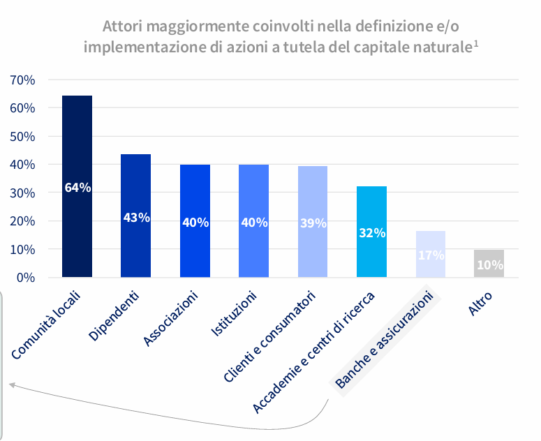 Le grandi imprese guidano il presidio del capitale naturale grazie a strumenti strutturati, come piani di transizione per la biodiversità e interventi di rigenerazione dei siti contaminati, già adottati da circa la metà di esse, contro il 44% delle medie e il 29% delle piccole. Anche la valutazione degli impatti su specie protette conferma questo divario dimensionale. Nel coinvolgimento degli stakeholder, le comunità locali risultano i partner più importanti per il 64% delle imprese. Al contrario, banche e assicurazioni hanno un ruolo molto limitato, principalmente perché mancano ancora metriche e dati affidabili che permettano al settore finanziario di integrare in modo efficace i temi del capitale naturale nei propri processi decisionali.