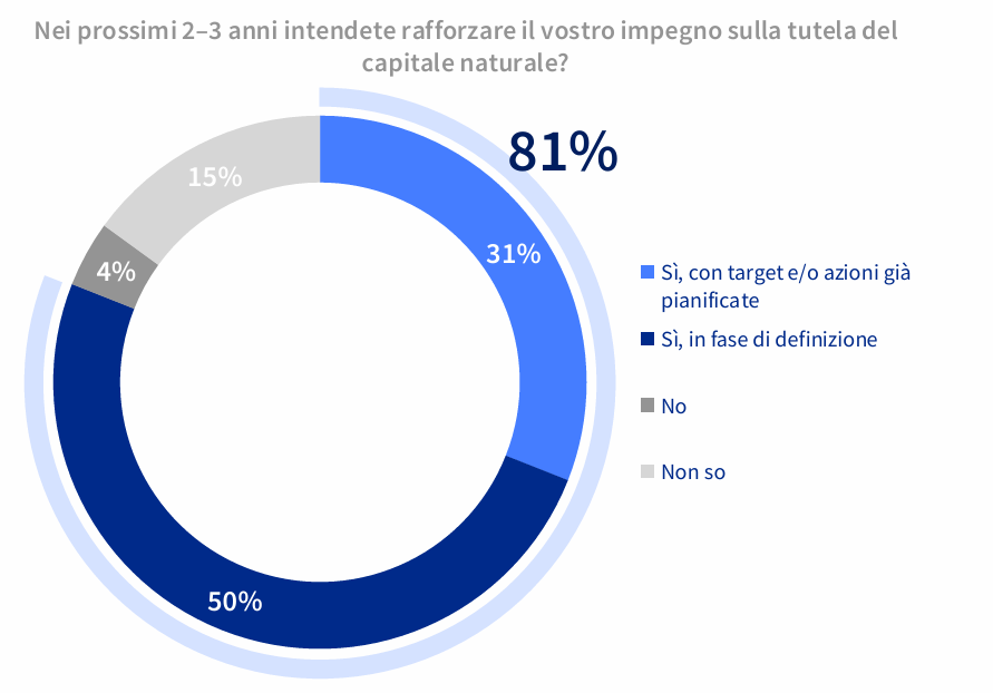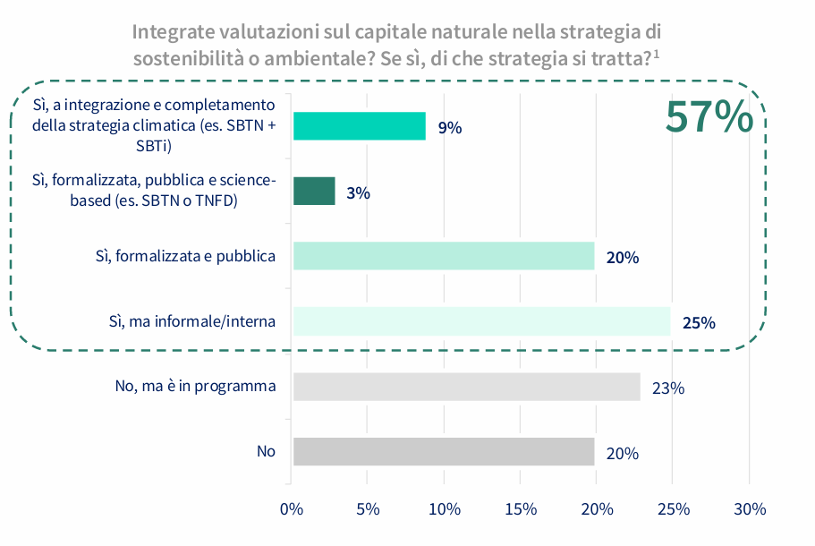 Oltre la metà delle imprese analizzate (57%) dichiara di aver già integrato le valutazioni sul capitale naturale nella propria strategia ambientale o di sostenibilità, con un ulteriore 23% che prevede di farlo nel breve periodo. In totale, quasi otto aziende su dieci hanno quindi già avviato, o intendono avviare a breve, un percorso di integrazione del capitale naturale nei propri strumenti di pianificazione strategica.