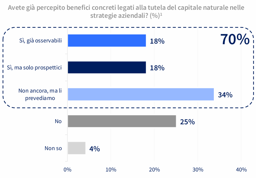 È importante sottolineare che il 70% delle imprese riconosce i benefici legati all’integrazione del capitale naturale nelle proprie strategie aziendali, sebbene con livelli differenti di maturità. In particolare, il 18% dichiara benefici già osservabili e la stessa quota (18%) li considera prospettici. Il 34% prevede di rilevarli nel prossimo futuro.
