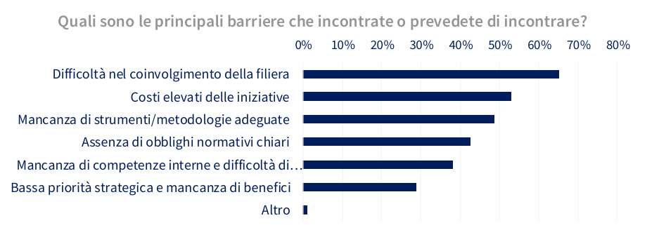 Ma l’adozione di misure concrete è spesso ostacolata da difficoltà operative. Le principali barriere riguardano il coinvolgimento della filiera (65%), i costi elevati (53%), la mancanza di strumenti adeguati (49%) e di competenze (38%). Per superarle, le aziende chiedono incentivi economici (64%), strumenti di misurazione (57%) e metodologie pratiche (56%).