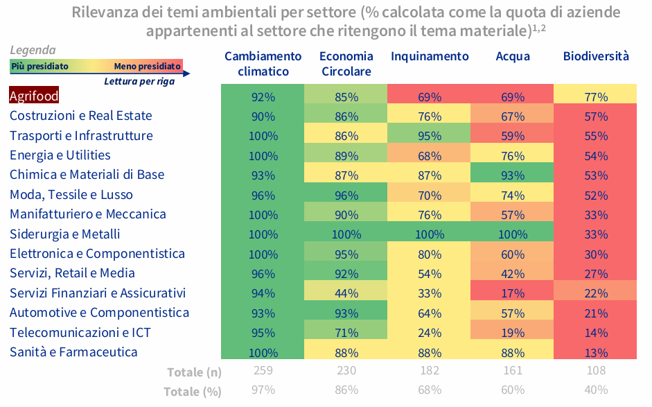 In sintesi, sebbene i settori a più alta vulnerabilità stiano compiendo i primi passi, per il tessuto imprenditoriale italiano rimane prioritario trasformare la consapevolezza dei rischi in azioni operative misurabili, specie per quanto riguarda le dipendenze dagli ecosistemi.