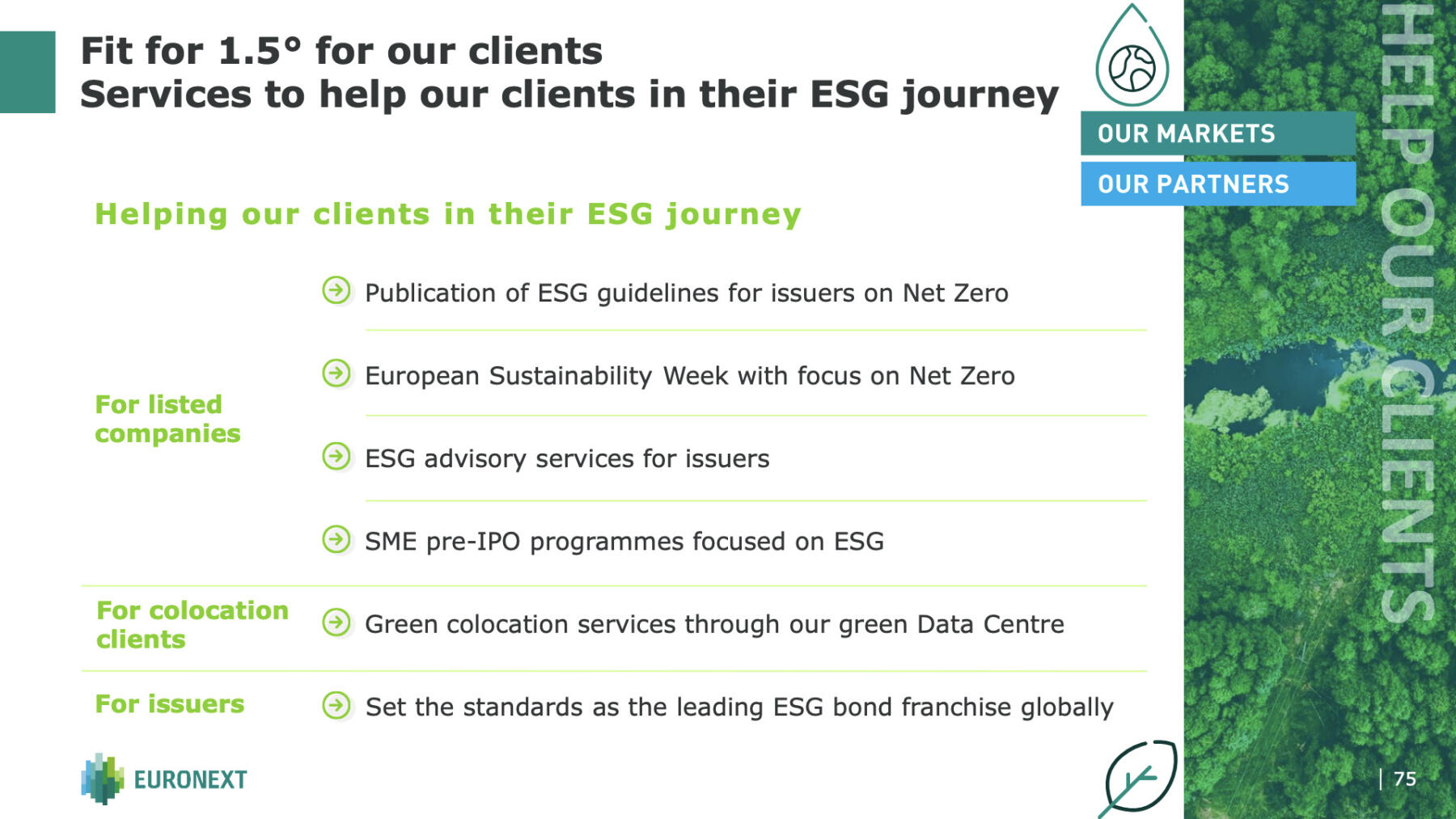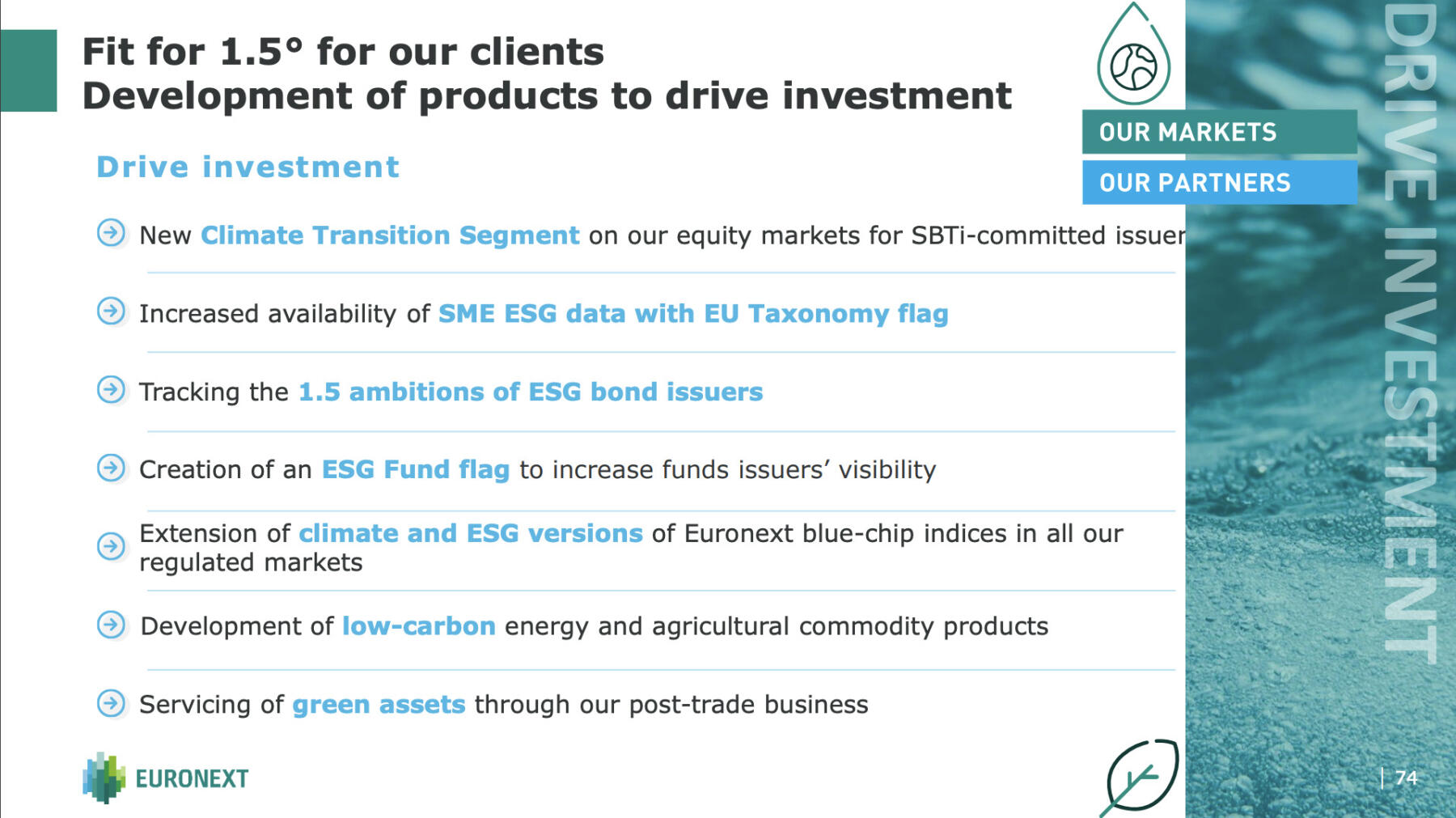 La strategia si concentra sull’accelerazione dell’azione per il clima sia nelle operazioni di Euronext sia attraverso il ruolo che svolge nel promuovere la finanza sostenibile in tutti i suoi mercati. Questo obiettivo sarà raggiunto sviluppando ulteriori servizi e prodotti che aiutino gli investitori e gli emittenti a impegnarsi nella transizione verso un’economia sostenibile.