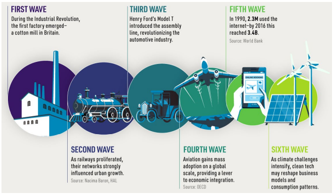 Il ruolo chiave delle tecnologie pulite nella sesta ondata industriale, insieme alla digitalizzazione/IA e alla robotica, è ormai sempre più riconosciuto (Figura 1). Siamo solo all’inizio di un processo che vedrà le tecnologie green occupare un posto sempre più centrale negli investimenti pubblici e privati nei prossimi decenni.