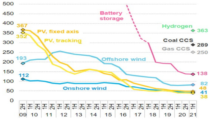 La transizione verso l’energia pulita è necessaria anche dal punto di vista economico. Le rinnovabili sono ormai la forma più economica di generazione di nuova elettricità in circa il 90% del mondo e la recente impennata dei prezzi dei combustibili fossili ne migliora ulteriormente la competitività relativa in termini di costi (Figura 2). Inoltre il costo della mancata mitigazione del cambiamento climatico porterebbe a un’erosione del PIL annuale superiore al 3% entro il 2030. Infine, nel lungo periodo, il passaggio alle rinnovabili implica che governi e società non saranno più esposti alla volatilità dei prezzi delle materie prime, con evidenti benefici sociali.