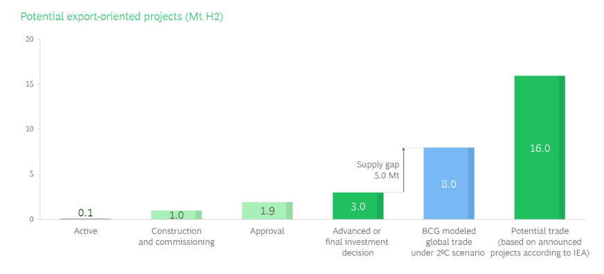 Per ottenere una visione più approfondita della situazione, BCG ha esaminato da vicino il mercato per il commercio di idrogeno a basse emissioni di carbonio in Europa. Quest’area geografica, infatti, dato che ha una capacità limitata di energia rinnovabile necessaria per la produzione di idrogeno su larga scala, sarà il principale importatore di volumi di idrogeno a basse emissioni entro il 2030. Ma le previsioni di BCG mostrano che, probabilmente, nel 2030 la fornitura di idrogeno a basse emissioni importato in Europa sarà ben al di sotto dei 5 megatoni necessari per essere in linea con gli obiettivi net zero dell’UE.