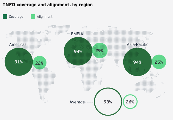 Guardando alle aree geografiche, il rapporto mostra un’Europa più avanzata rispetto al resto del mondo: le imprese dell’area EMEIA (Europa, Medio Oriente, India e Africa) menzionano la natura nel 94% dei casi e il 29% è allineato alle raccomandazioni TNFD, grazie soprattutto alla spinta regolatoria della Corporate Sustainability Reporting Directive (CSRD) e dallo standard ESRS E4 su biodiversità ed ecosistemi, che obbligano le imprese europee a integrare gli impatti sulla natura nei bilanci di sostenibilità. Tuttavia, come sottolinea anche l’EY CSRD Barometer 2025, molte aziende europee si limitano ancora a soddisfare i requisiti formali senza tradurre le informazioni in strategie di valore o di resilienza.