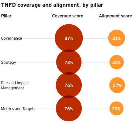 La governance è il pilastro più sviluppato, con l’87% delle aziende che ne parla e il 31% che raggiunge un buon grado di allineamento, segno che la supervisione dei consigli di amministrazione sulle questioni naturali sta diventando prassi.