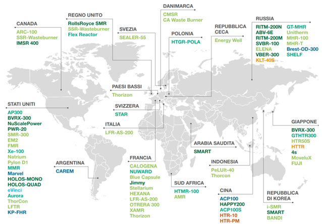 Gli AMR, ossia i nuovi reattori di IV generazione, sono invece ancora in fase di ricerca (TRL 5-6) e si distinguono per le elevate temperature di uscita e una gestione ottimizzata del combustibile, aprendo a usi cogenerativi e industriali particolarmente rilevanti. Il Nuclear Energy Innovation Outlook mostra come tutti gli scenari internazionali prevedano una crescita significativa della capacità installata di SMR al 2050 e come, parallelamente, molti Paesi stiano accelerando anche nella costruzione di nuovi reattori modulari. Sono ancora pochi i progetti SMR in funzione o in stato avanzato di realizzazione (si veda la mappa sottostante), ma molti sono in fase di progetto (in particolare in Occidente, probabilmente perché si ritiene che possano essere più accettabili socialmente), perché più flessibili e con costi CAPEX ridotti.