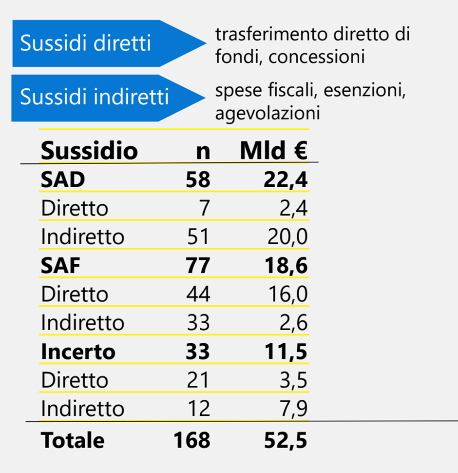 Accanto ai SAD, ci sono invece i sussidi ambientalmente favorevoli (SAF), pari a 20,3 miliardi di euro, che sostengono pratiche sostenibili e rispettose dell’ambiente. Tuttavia, un dato critico riguarda i sussidi ambientalmente incerti (SAI), che raggiungono 13,8 miliardi di euro e per i quali l’impatto ambientale non è ancora definito con chiarezza.