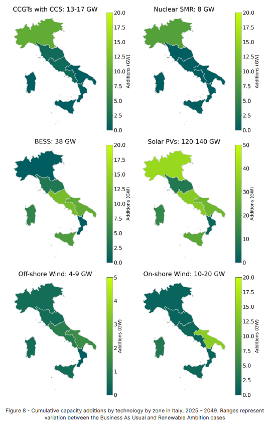 Per riuscire a raggiungere l’obiettivo europeo della riduzione del 55% di emissioni al 2030 e quello nazionale di una diminuzione tra il 58 e il 66% nel settore elettrico, GE Vernova ha considerato due scenari. Nel Renewable Ambition, l’unico che consente all’Italia di rispettare sia le scadenze del 2030 che del 2050, occorre raddoppiare la capacità rinnovabile a 90 GW di eolico e fotovoltaico entro cinque anni, con ulteriori investimenti in accumuli e rete. Parliamo di 40 GW di sistemi di batterie, fino a 17 GW di turbine a gas con cattura della CO₂ (CCGT+CCS) e 8 GW di piccoli reattori modulari nucleari (SMR).