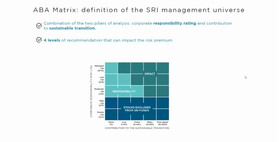 Si è parlato anche della filosofia che è alla base del processo di rating di DNCA, ovvero il modello ABA (Above and Beyond Analysis) che permette di selezionare quei titoli che hanno un impatto positivo nei confronti delle sfide legate allo sviluppo sostenibile, un metodo strutturato su sette pilastri complementari di analisi: responsabilità aziendale, transizione sostenibile, controversie, coinvolgimento, contributo agli obiettivi dello sviluppo sostenibile, clima e impatto.