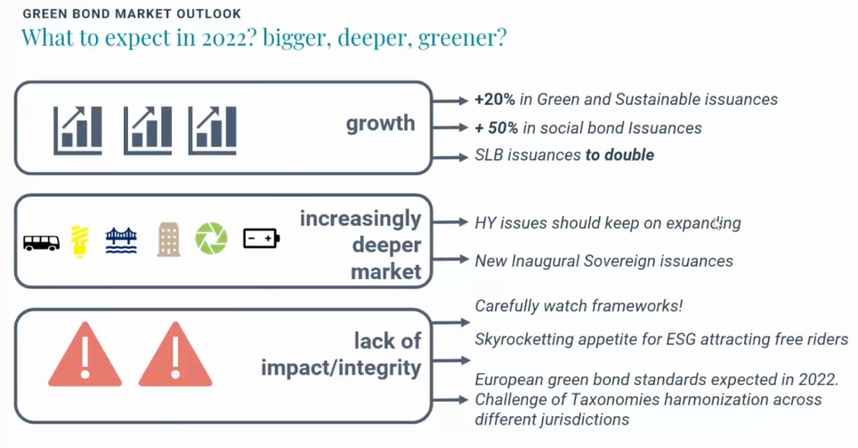 Per quanto riguarda il mercato dei green bond, invece, nel 2022 è previsto un incremento del 20% delle obbligazioni verdi e sostenibili, un aumento del 50% delle emissioni di obbligazioni legate a tematiche sociali e addirittura un raddoppio delle obbligazioni SLB (SDG-linked-bond). Anche gli High Yield bond dovrebbero continuare ad espandersi. A dirlo sono Agathe Foussard, Fixed income Portfolio Manager e Felipe Gordillo, ESG Senior Analyst di Mirova. Gli aspetti da tenere sott’occhio, secondo gli esperti di Mirova, sono il rischio che le obbligazioni ESG diventino troppo appetibili per i free rider e le sfide legate alla necessaria standardizzazione delle Tassonomie nelle diverse giurisdizioni.