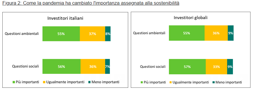 Se la pandemia ha fatto crescere l’importanza delle questioni ambientali e sociali, gli investitori sono sempre più convinti che sia necessario intraprendere concretamente azioni volte a mitigare le pratiche non sostenibili e che la responsabilità di tali mosse sia da assegnare prevalentemente a governi e aziende, con un certo ruolo riconosciuto anche agli asset manager.