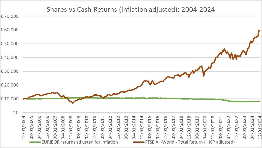 Il denaro liquido sembra sicuro, ma il suo valore è eroso dall’inflazione. L’inflazione significa che 10 mila euro liquidi risparmiati nel 2004 varrebbero oggi solo 8.139 euro in termini “reali”. Lo stesso importo investito nel mercato azionario globale varrebbe oggi 59.352 euro, in termini reali, al netto dell’inflazione.