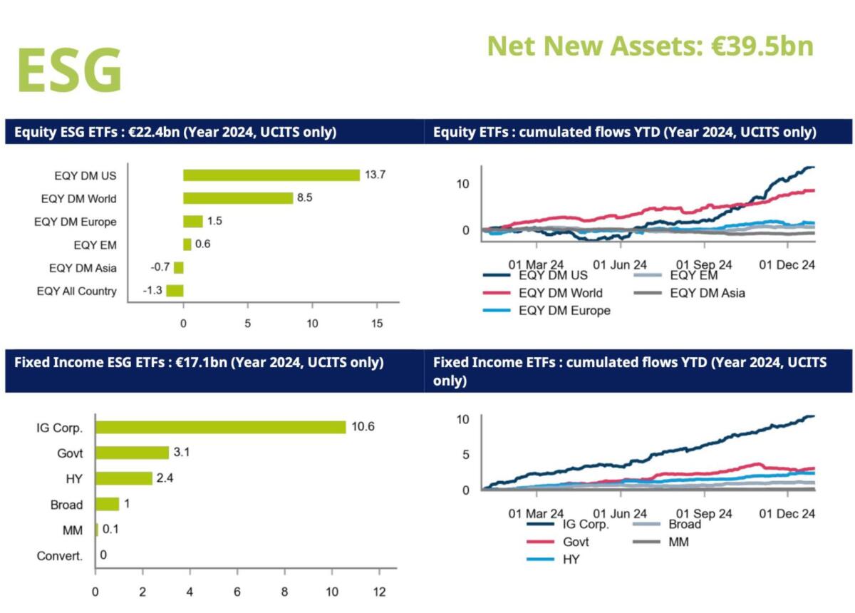 Anche gli ETF UCITS a reddito fisso hanno attirato afflussi significativi, per un totale di 58 miliardi di euro a fine anno, leggermente inferiore ai massimi toccati nel 2023 con 62 miliardi di euro. Ben 17,1 miliardi di euro sono stati raccolti dalle strategie a reddito fisso ESG, circa il 30% degli afflussi complessivi.