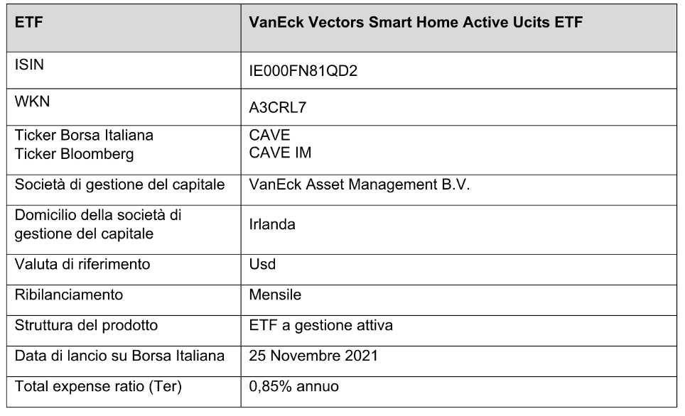 La società di gestione VanEck ha quotato oggi su Borsa Italiana il VanEck Vectors Smart Home Active Ucits ETF, il primo ETF europeo sulle case intelligenti e il suo primo ETF a gestione attiva in Europa, offrendo così agli investitori l’opportunità di accedere alle innovative tecnologie collegate a questo megatrend.
