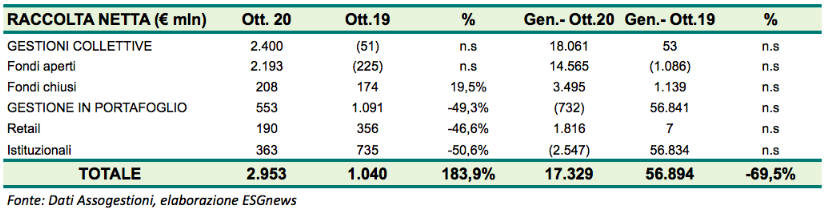 Nel mese di ottobre l’industria del risparmio gestito in Italia ha totalizzato una raccolta netta pari a 2.953 milioni di euro secondo i dati di Assogestioni. In particolare, i fondi di investimento, ad eccezione dei fondi monetari, hanno registrato un risultato pari a +4,3 miliardi di euro. Questo dato ha portato il saldo delle sottoscrizioni del sistema da inizio anno a +17,3 miliardi di euro. Le gestioni collettive hanno raccolto 2,4 miliardi di euro, mentre sono entrati nelle casse delle gestioni di portafoglio 553 milioni di euro.