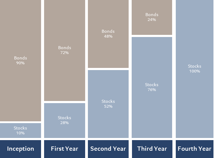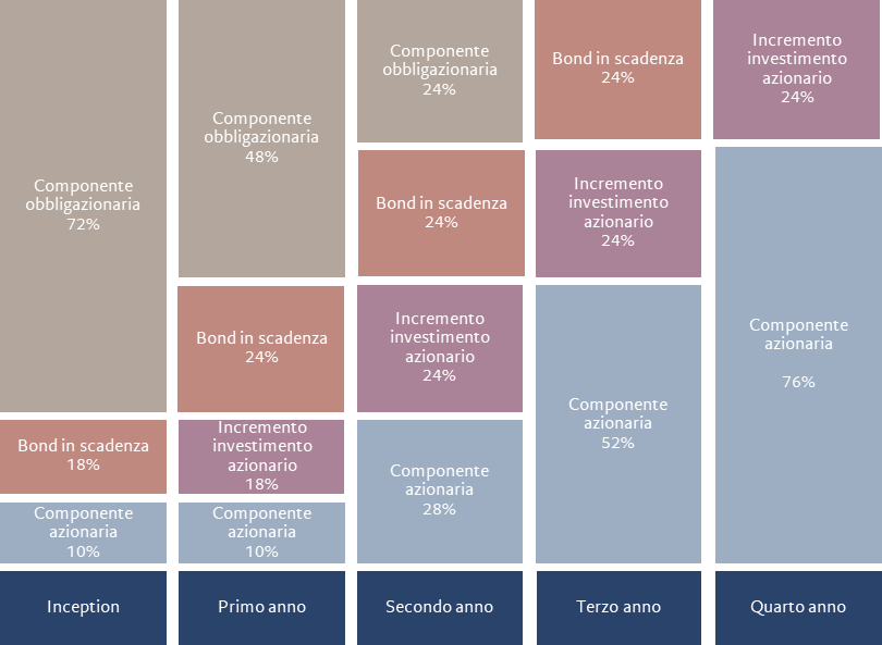 La nuova soluzione è, infatti, progettata per accompagnare l‘investitore in maniera graduale da un’esposizione conservativa a una azionaria e permetterà di far ruotare, nell’arco di quattro anni e su base trimestrale, il portafoglio da un fondo 90% obbligazionario governativo italiano a un altro con composizione 100% azionaria.