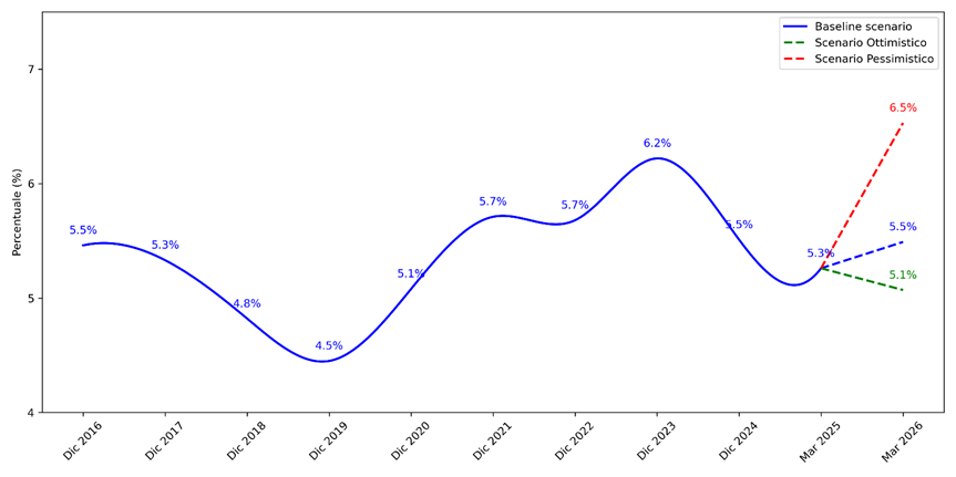 In uno scenario ottimistico la PD media invece scende al 5,1%, grazie all’abbandono della linea dura USA sui dazi e alla stipula di una tregua duratura o pace tra Russia e Ucraina, con una conseguente ripresa della fiducia dei mercati e degli operatori economici, un calo dell’inflazione e dei tassi d’interesse.