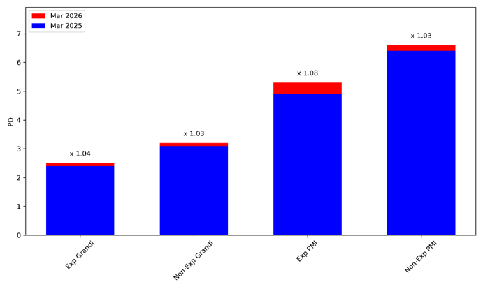 Entrando più in dettaglio del Credit Outlook nello scenario base, i settori che vedono un maggior aumento della PD sono quelli ciclici, di consumo e discrezionali, più esposti alla congiuntura economica e all’export verso gli Stati Uniti. Fra questi, l’automotive (la cui PD media passa dal 5,2% di marzo 2025 al 5,7% di marzo 2026), il tessile-abbigliamento (da 5,7% a 6,1%), i beni alimentari e bevande (da 4,6% a 4,9%) e il farmaceutico (da 4,2% a 4,5%). Al contrario, è attesa in riduzione la PD di settori meno legati alle dinamiche del commercio internazionale, fra cui i servizi per turismo, ospitalità e ristorazione (dall’8,7% del marzo 2025 all’8% del marzo 2026), ICT (da 4,6% a 4,4%) e utilities (da 4,2% a 4%). La probabilità di default per le grandi imprese è prevista in tenuta attestandosi al 3,1% a marzo 2026, mentre per le PMI la PD aumenta da 6,3% del 2025 a 6,6% del 2026.