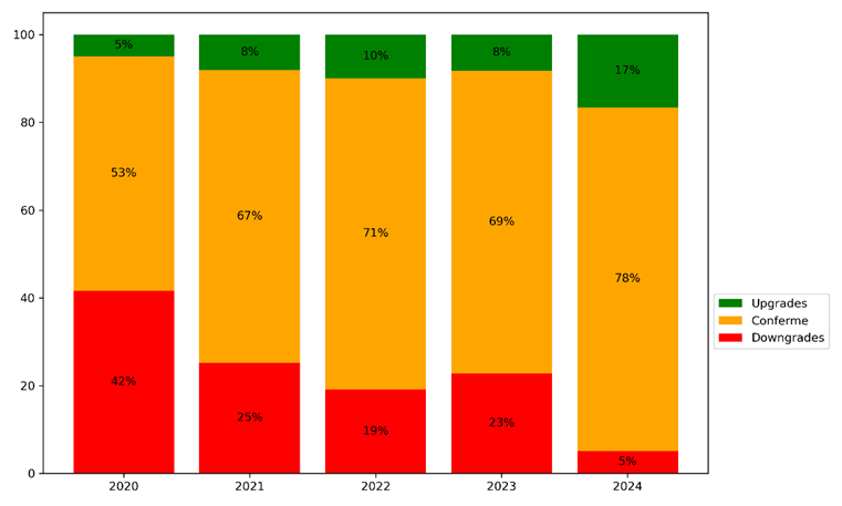 Il rischio di credito per le imprese non finanziarie italiane, espresso dalla probabilità di default (PD), si è attestato al 5,3% a marzo 2025, il dato più basso da dicembre 2020. A dirlo è il Credit Outlook 2025 di Cerved Rating Agency, l’agenzia di rating italiana specializzata nel merito creditizio delle imprese e nella misurazione delle performance ESG. Nel corso del 2024 infatti è aumentata la quota di aziende che hanno migliorato la loro posizione: il 17% delle rating actions (aggiornamenti creditizi) è stato classificato come upgrades contro l’8% dell’anno precedente. Sono inoltre cresciute le conferme di rating di credito (78% contro 69%), anche grazie al minor costo del denaro e una maggior salute dei bilanci delle imprese.