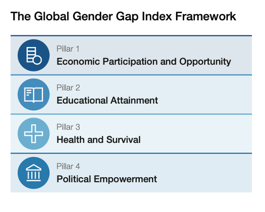 L’Indice globale del divario di genere, dalla sua istituzione nel 2006, valuta lo stato attuale e l’evoluzione della parità di genere in quattro dimensioni chiave: partecipazione economica e opportunità, risultati scolastici, salute e sopravvivenza ed emancipazione politica.