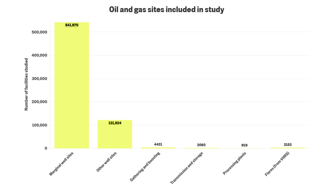 Il nuovo studio ha analizzato 673.940 strutture totali, tra cui 541.970 siti di pozzi a bassa produttività, 121.824 siti di pozzi non a bassa produttività, 4.431 stazioni di compressione per raccolta e potenziamento, 2.093 stazioni di compressione per trasmissione e stoccaggio, 919 impianti di lavorazione e 3.153 focolai di combustione rilevati dal database satellitare VIIRS.