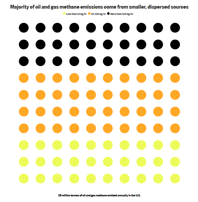 La stragrande maggioranza di queste strutture emette meno di 100 kg di metano all’ora, ma nel loro insieme contribuiscono al 70% delle emissioni totali di metano. Per una gestione efficace delle emissioni di metano, è essenziale tenere conto di queste fonti.