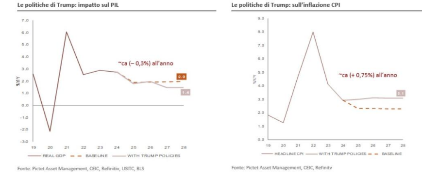 L’agenda Trump è fatta di quattro categorie di interventi: tariffe sul commercio (60% minacciate sulle merci cinesi e fino al 20% sul resto del mondo), immigrazione, deregolamentazione (che ha spinto il mercato azionario) e tema fiscale. Due di queste, immigrazione e tariffe, avrebbero un impatto negativo sull’offerta aggregata, mentre la deregolamentazione ne avrebbe uno positivo. Inoltre, gli sgravi fiscali rappresentano una politica di sostegno alla domanda aggregata, sebbene la finestra di azione sia oggi limitata, considerato ad esempio che le imposte sul reddito delle società sono già state ridotte dal 35% al 21% nel 2017 col TCJA. A nostro parere, il risultato complessivo dell’agenda Trump dovrebbe concretizzarsi in un impatto leggermente negativo sulla crescita da un lato, generando dall’altro un rialzo dell’inflazione. Nel provare ad azzardare previsioni, la difficolta sta nel capire cosa ci sia di vero nelle promesse di Trump: sulle tariffe, ad esempio, l’idea ad oggi e che potrebbero essere introdotte sulle merci in modo graduale. La nostra proiezione si basa sull’ipotesi che venga realizzata la meta di quanto minacciato sia per la Cina (ovvero il 30%) che per il resto del mondo (quindi il 10%).