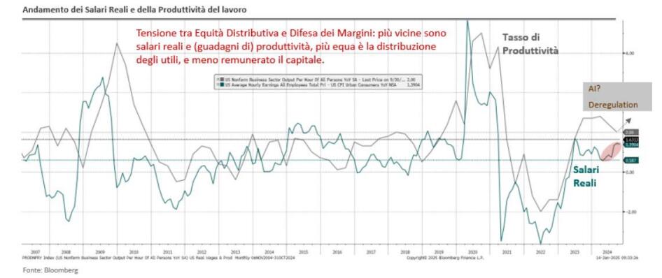 L’eccezionalismo americano sostiene gli utili delle aziende: le prospettive per bond e azioni Infine, c’è un altro fattore da considerare che contraddistingue l’eccezionalità della situazione americana: se il tasso di produttività, trainato dalle innovazioni tecnologiche e dall’intelligenza artificiale, continuerà a crescere a livelli elevati (siamo al 2%), possiamo considerare sostenibile l’attuale livello particolarmente alto di crescita dei salari (Figura 2). Pertanto, finchè la produttività si manterrà su questo tenore, le pressioni inflazionistiche dovrebbero rimanere sotto controllo. Una notizia positiva per gli investitori del mercato azionario.