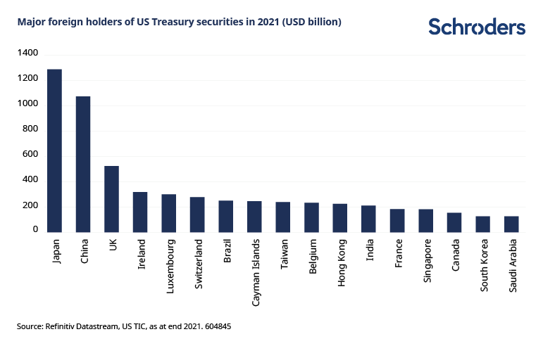 Questi Paesi detenevano complessivamente titoli del Tesoro USA per un valore medio di 1.100 miliardi di dollari a gennaio 2022, pari al 15% delle riserve estere.
