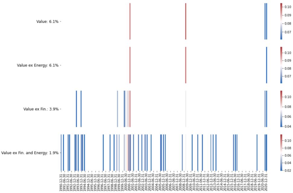 Figura 1: Mesi in cui Value (basso P/B) ha avuto una sovra performance superiore a quella osservata in febbraio 2021.