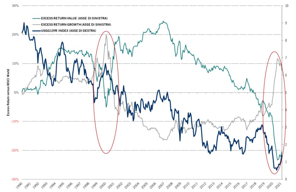 Figura 2: Value, Growth eccesso di rendimento storico ed evoluzione dei tassi a 10 anni US dal 1.1.1990 al 28.02.2021.
