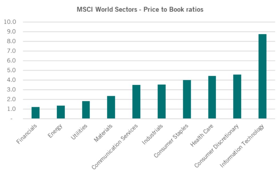 Figura 3: Livelli Price/Book dei diversi settori dell’indice MSCI World al 28.02.2021. Pictet Asset Management,