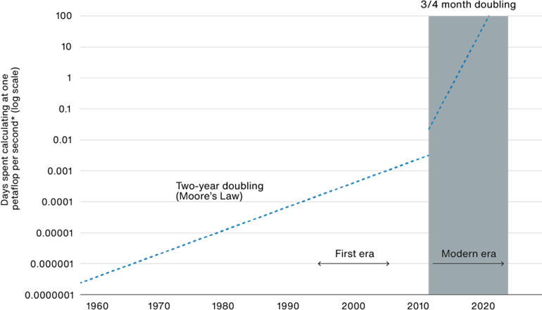 Il grafico sottostante illustra gli ultimi 60 anni di notevoli progressi nel calcolo utilizzato per addestrare i sistemi di apprendimento automatico, che hanno rispecchiato il raddoppio della Legge di Moore fino a circa un decennio fa. Ora, la quantità di calcolo utilizzata sta accelerando ancora di più, un progresso che non sarebbe stato possibile senza i chip prodotti dall’azienda tecnologica Nvidia.