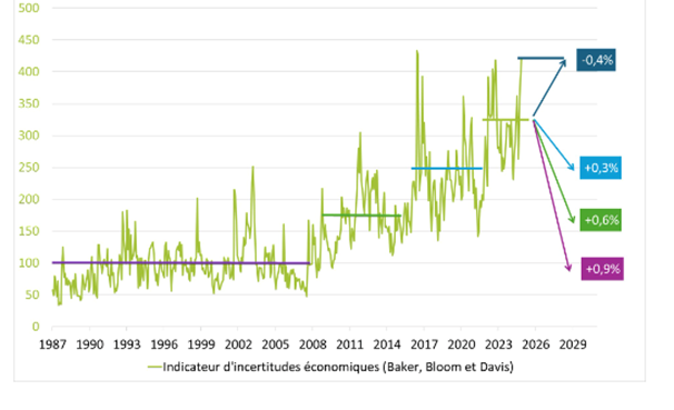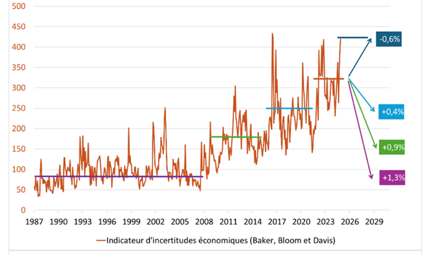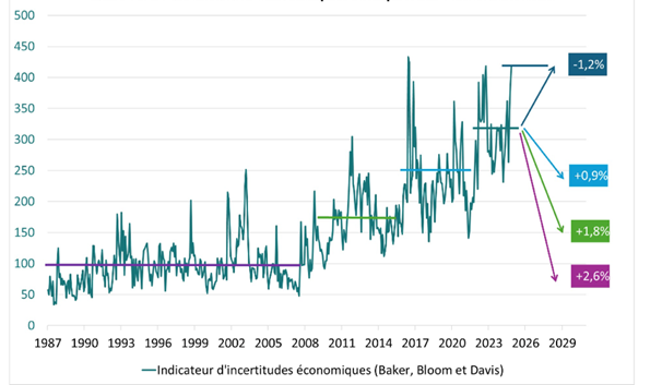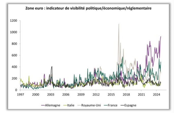 Tuttavia, un fattore potrebbe ritardare questa ripresa degli investimenti: l’aumento delle incertezze. In Europa, le incertezze commerciali, geopolitiche e politiche, misurate dagli indici sviluppati da Baker, Bloom e Davis (Economic Policy Uncertainty Index), stanno aumentando significativamente in Francia, e ancor di più in Germania (grafico 2).