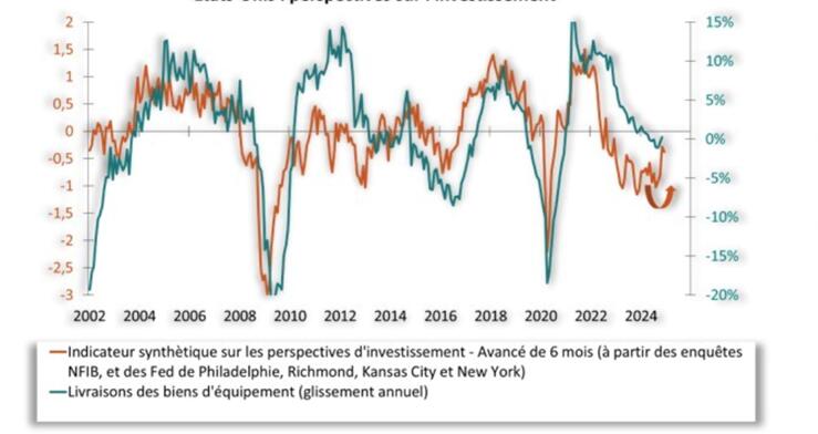 Ma con il nuovo anno, «i semafori sono verdi». Infatti, quasi tutti i fattori macroeconomici indicano una ripresa progressiva degli investimenti nei paesi sviluppati: le esigenze di investimento sono enormi, le condizioni di finanziamento stanno tornando favorevoli, la redditività delle imprese è generalmente in aumento, le aziende hanno ridotto il loro indebitamento e, infine, i consumi sono sufficientemente resilienti da rassicurare le imprese sui loro sbocchi di mercato. Il nostro indicatore degli investimenti negli Stati Uniti mostra già segnali di «uscita verso l’alto» (grafico 1).