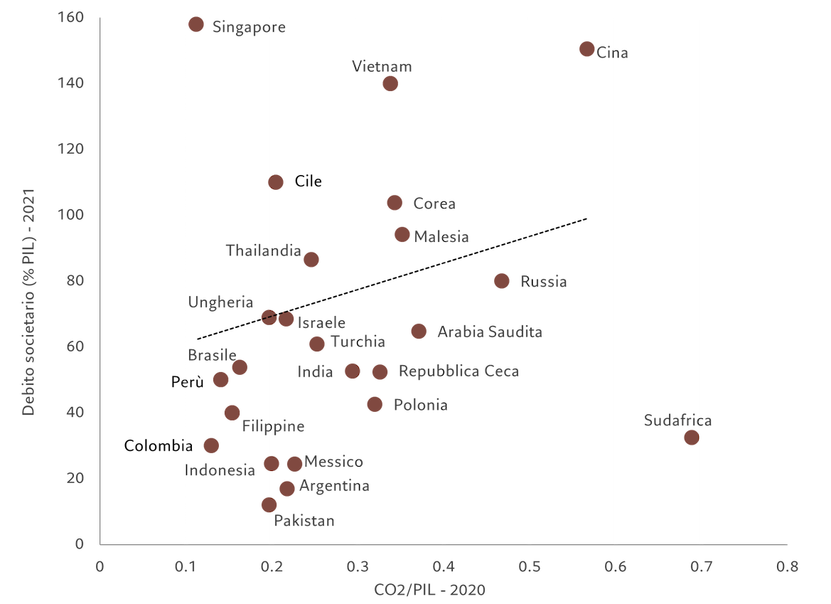 L’analisi esamina il rapporto tra debito e intensità di carbonio. Osserviamo che maggiori sono le emissioni di carbonio di un Paese rispetto al PIL, maggiore è il suo livello di debito societario.