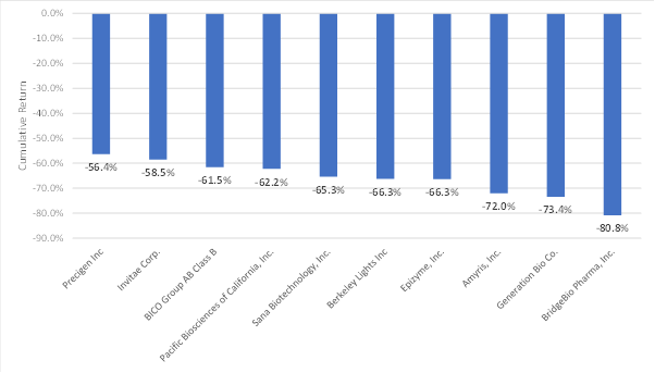 La BioRevolution è una delle strategie di investimento megatrend di WisdomTree. Il più recente ribilanciamento semestrale ha avuto luogo all’inizio di novembre 2021, periodo che, sfortunatamente, ha anche coinciso con il picco del mercato azionario a breve termine e l’inizio di un sell off più generalizzato, in particolare, nei segmenti di mercato più orientati alla crescita. La figura 1 mostra i dieci risultati peggiori in termini di prezzo delle azioni incluse nel WisdomTree BioRevolution Environmental, Social and Governance (ESG) Screened Index.