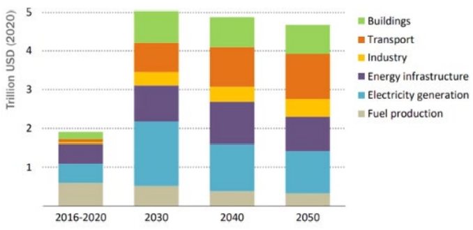 Figura 2: Investimenti annui medi nel settore energetico nel periodo 2016-20, e nello scenario di azzeramento netto delle emissioni entro il 2050