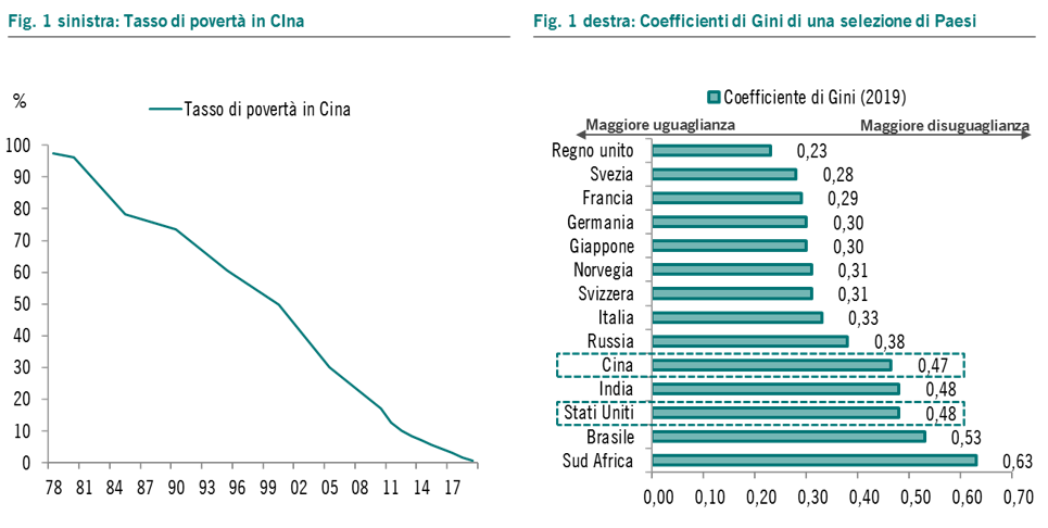 Guardando il coefficiente di Gini (indicatore della disuguaglianza nella distribuzione del reddito) di Cina e Stati Uniti, a qualcuno potrebbe venire da sorridere: i due Paesi, agli antipodi per sistema politico ed economico nonché contrapposti nella lotta per la leadership mondiale, presentano un livello di disuguaglianza estremamente simile e, peraltro, prossimo a quello di molti Paesi in via di sviluppo nonostante si tratti delle prime due economie al mondo (si veda la Fig. 1 destra). Le diverse forme di capitalismo dei due colossi hanno prodotto, quindi, risultati assimilabili dal punto di vista della (scarsa) distribuzione della ricchezza.