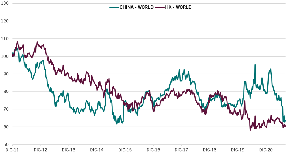 Fig. 3: Valutazioni relative del PB (Price to Book) di Cina e Hong-Kong rispetto al resto del mondo