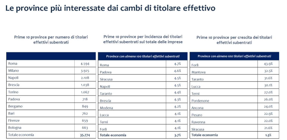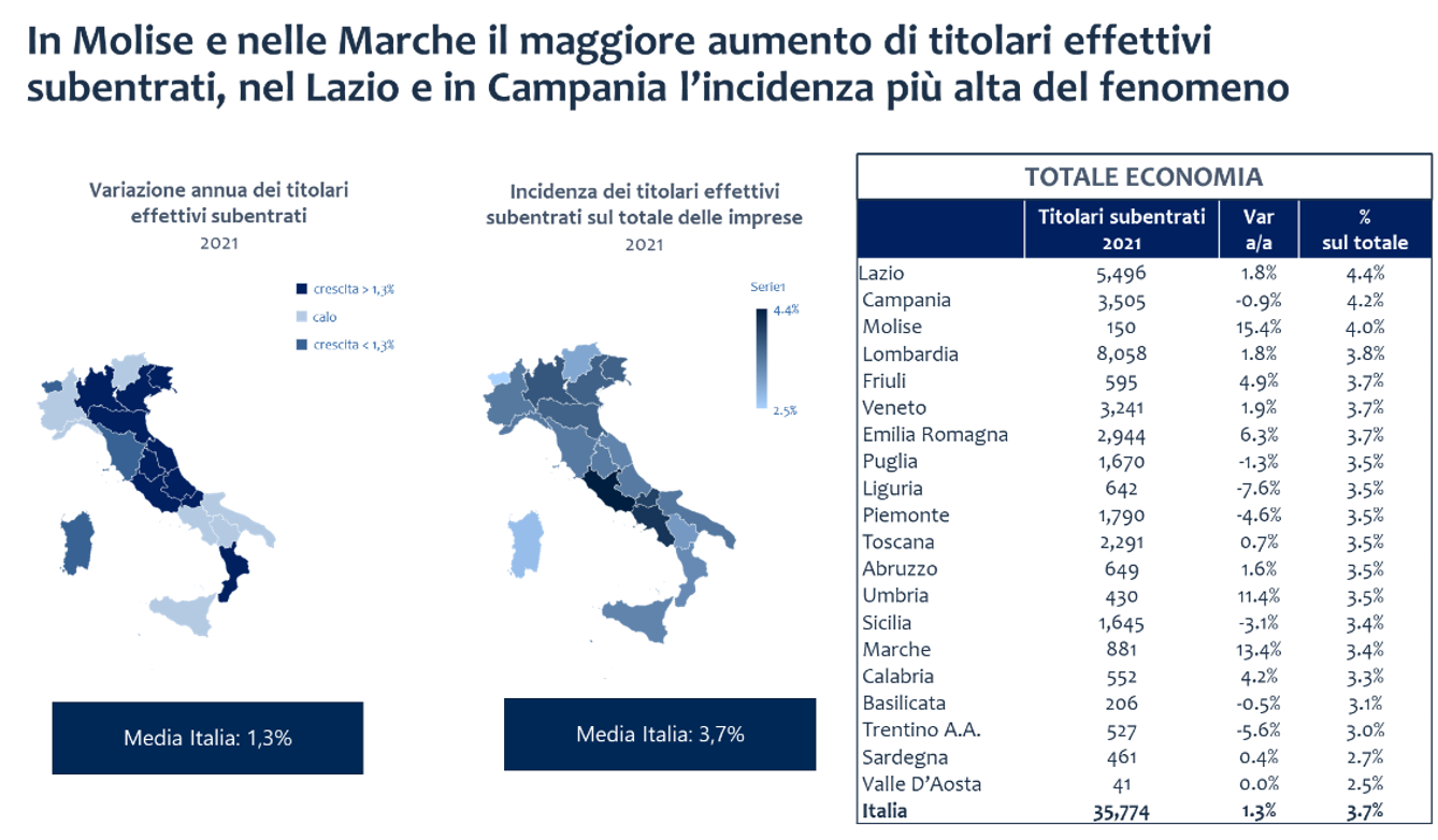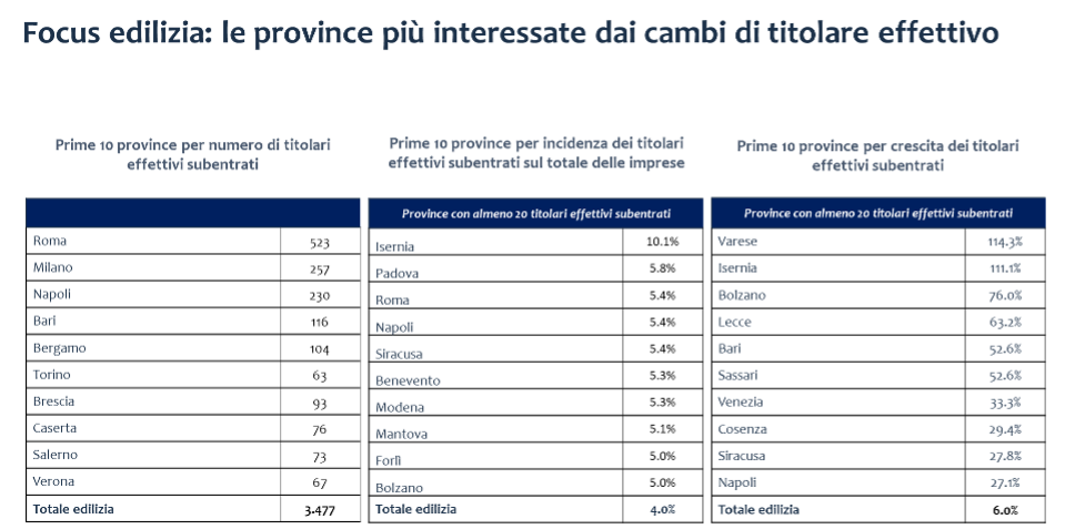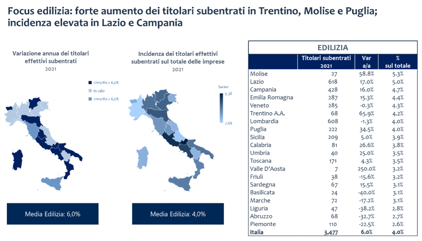 Le regioni con il maggiore aumento dei subentri nel settore edile sono state Trentino Alto Adige, con il 65,9% in più di variazioni, Molise (58,8%) e Puglia (34,5%), cui si aggiunge la Valle d’Aosta (25%) che però ha numeri ridottissimi; la più alta incidenza sul totale delle imprese si rileva invece in Molise (5,3%), Lazio (5%) e Campania (4,7%). Le province più interessate dai cambi di titolare effettivo sono Roma (523 variazioni), Milano (257) e Napoli (230), in percentuale invece Isernia (10,1%), Padova (5,8%), Roma, Napoli e Siracusa (5,4%).