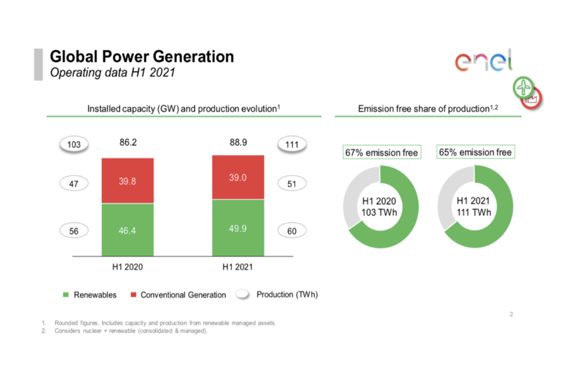 La potenza efficiente installata netta totale di Enel nel primo semestre 2021 è pari a 85,5 GW, con un aumento di 1,5 GW rispetto al 31 dicembre 2020.