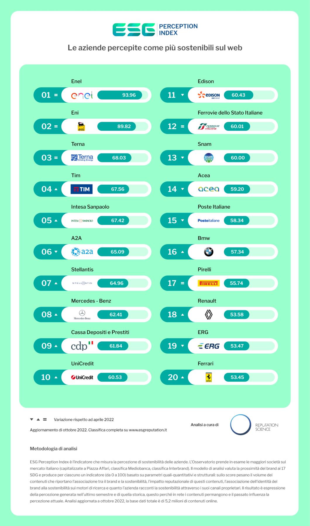 Undicesimo posto inoltre per Edison (60,43), che ha ampliato la propria presenza nei settori del fotovoltaico e della mobilità elettrica. Mentre si conferma la prima azienda del settore dei trasporti Ferrovie dello Stato Italiane (60,01): il gruppo, guidato da Luigi Ferraris, è una delle società che ha fatto registrare il maggior numero di contenuti online che la associano ai criteri ESG. Seguono altri due protagonisti del mondo energetico, Snam (60) e Acea (59,20), che si posizionano davanti a Poste Italiane (58,34) e Bmw (57,34).