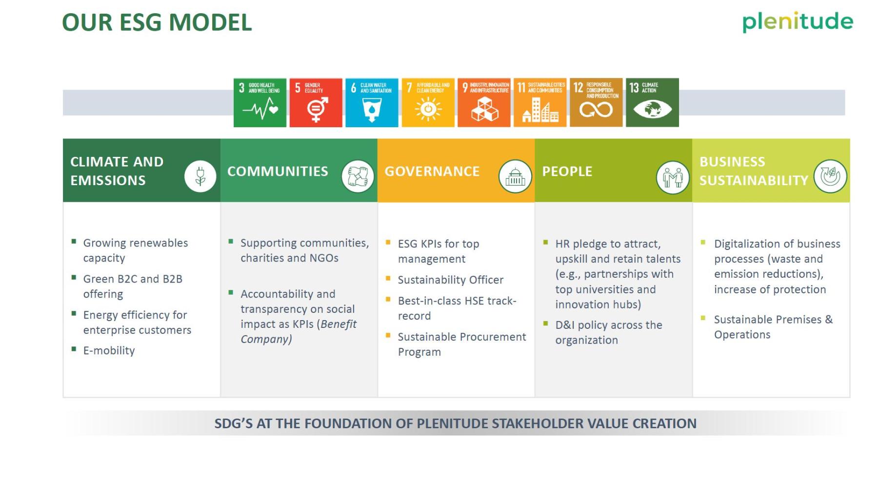 Il modello ESG proposto dalla neo-società si fonda su cinque punti cardine: emissioni e clima, comunità, governance, persone e sostenibilità aziendale. Tra le azioni previste vi sono il supporto a comunità, enti di beneficenza e ONG; la nomina di un responsabile alla sostenibilità; un programma per gli appalti sostenibili; l’impegno dell’HR ad attirare, migliorare e conservare i talenti (promuovendo, ad esempio, partnership con le migliori università e poli di innovazione); una politica per la Diversità e l’Inclusione (D&I); la digitalizzazione dei processi aziendali e un incremento della protezione.