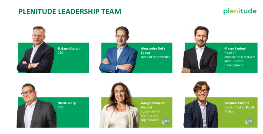 Il management, oltre all’ad Goberti vede la presenza di Alessandro Della Zoppa, Head of Renewables, Mauro Fanfoni, Head of International Markets and Business Development, Nicola Giorgi, CFO, Giorgia Molajoni Head of Sustainability, Identity and Digitalization e Pasquale Cuzzola, Head of Italian Retail Market.